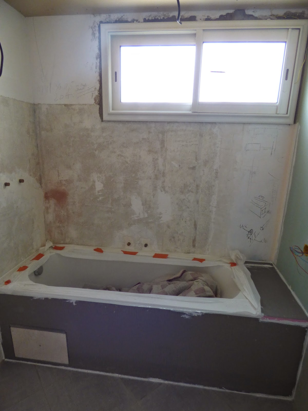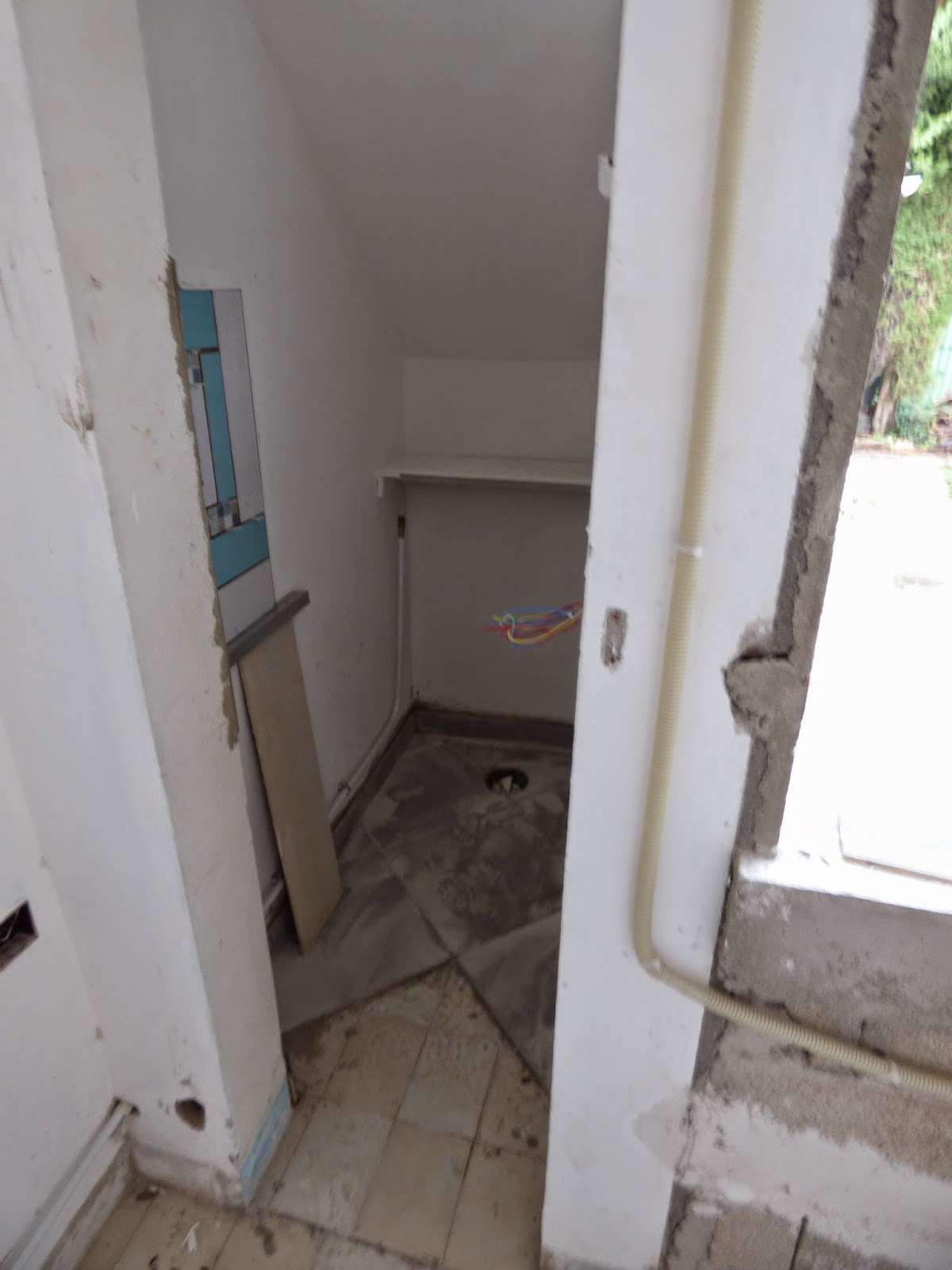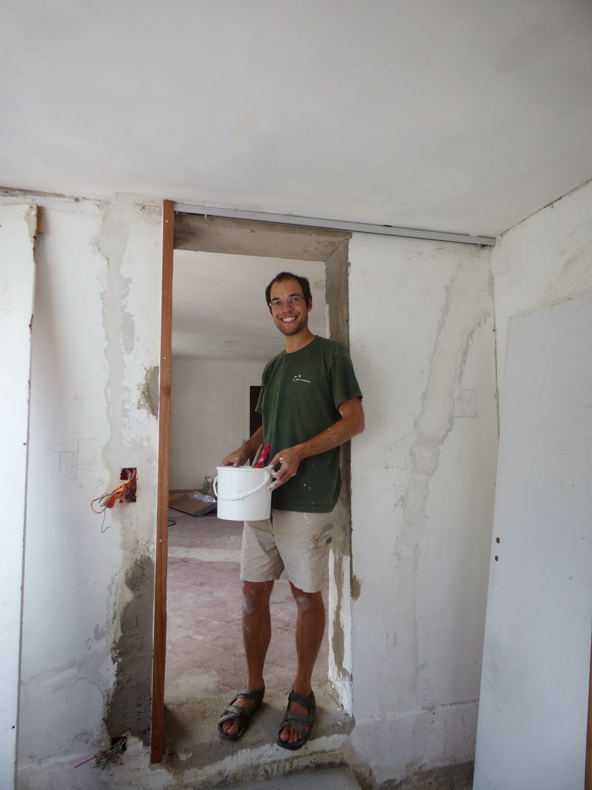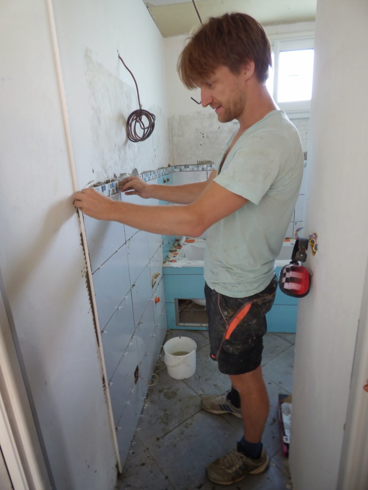 Ce week-end a été très productif, grâce à l’aide de Victor (et de Romain !). Ils ont travaillé à la salle de bain, et aux WC. Ils ont appliqué de l’enduit sur les murs, et posé la faïence murale.