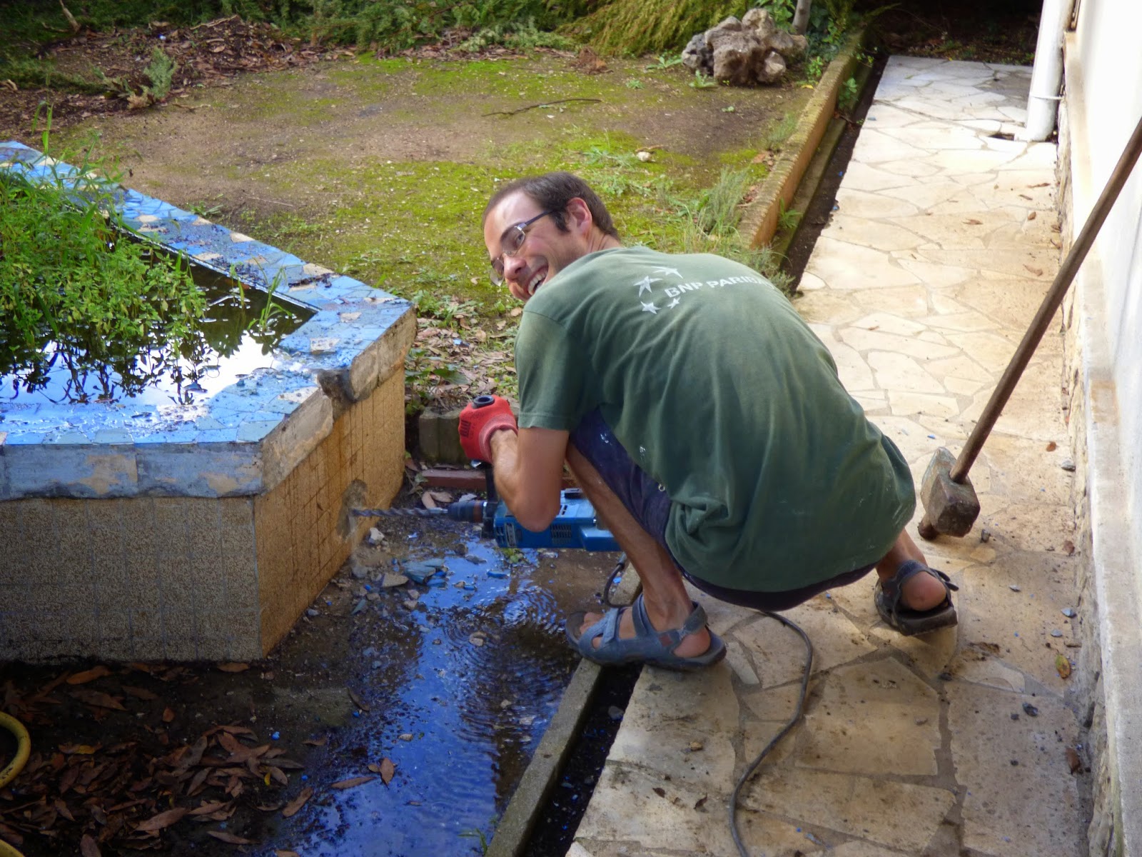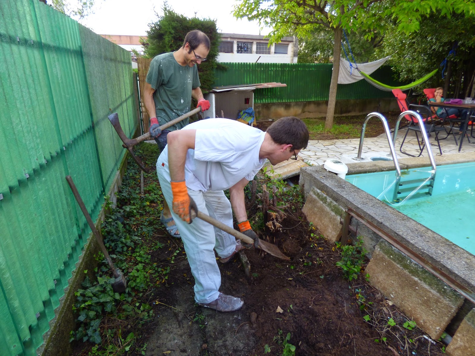 et les garçons ont fini de désoucher l’ancienne haie de thuyas et ont attaqué l’ancien bassin à poissons rouges.