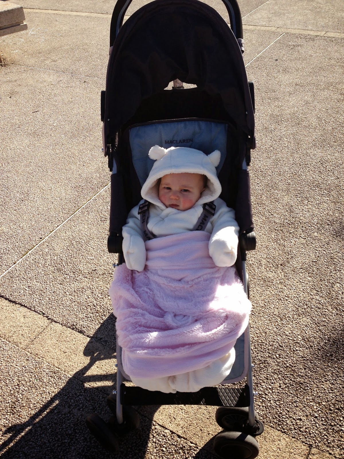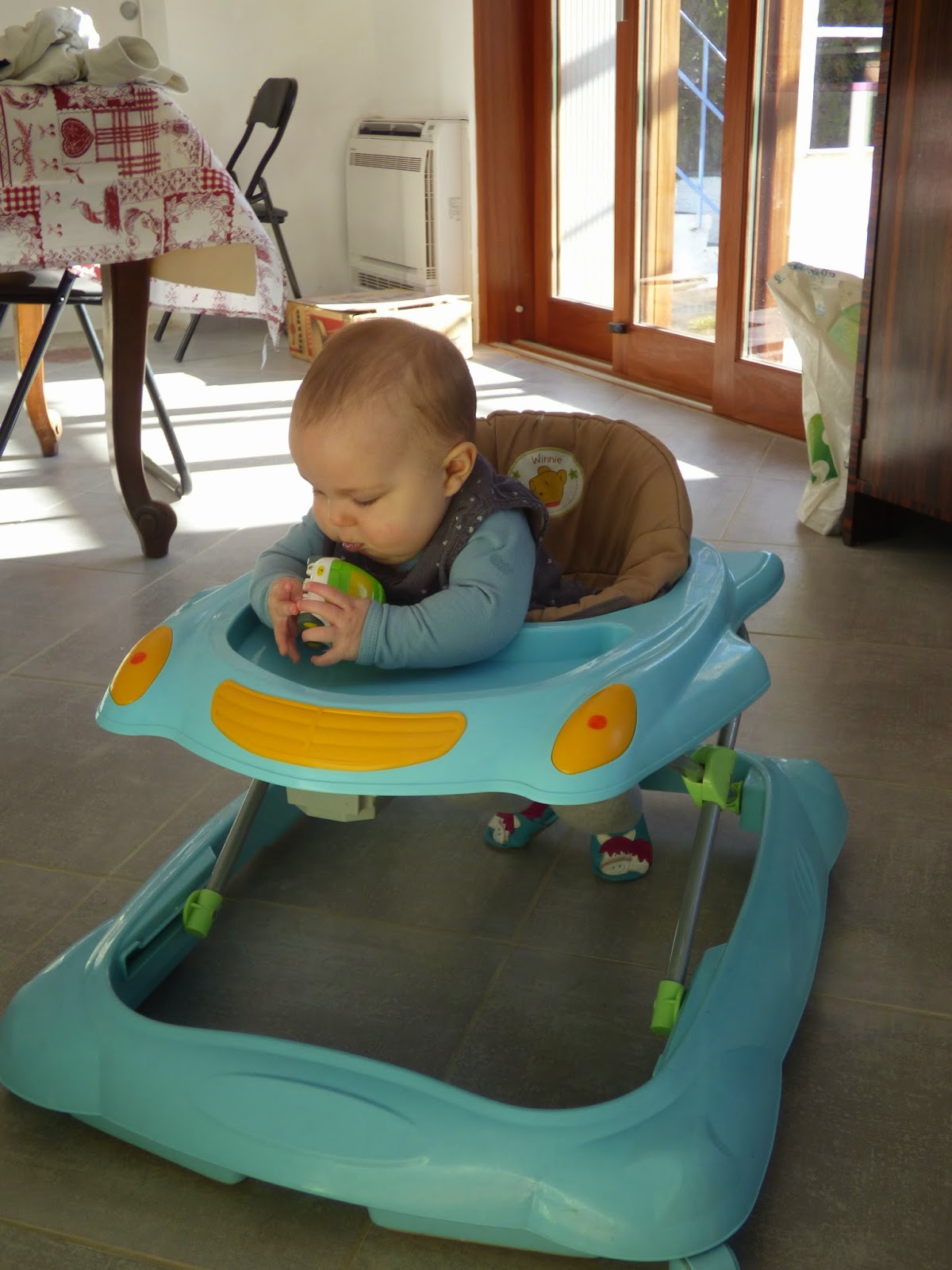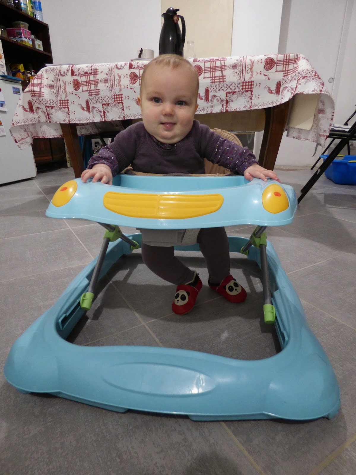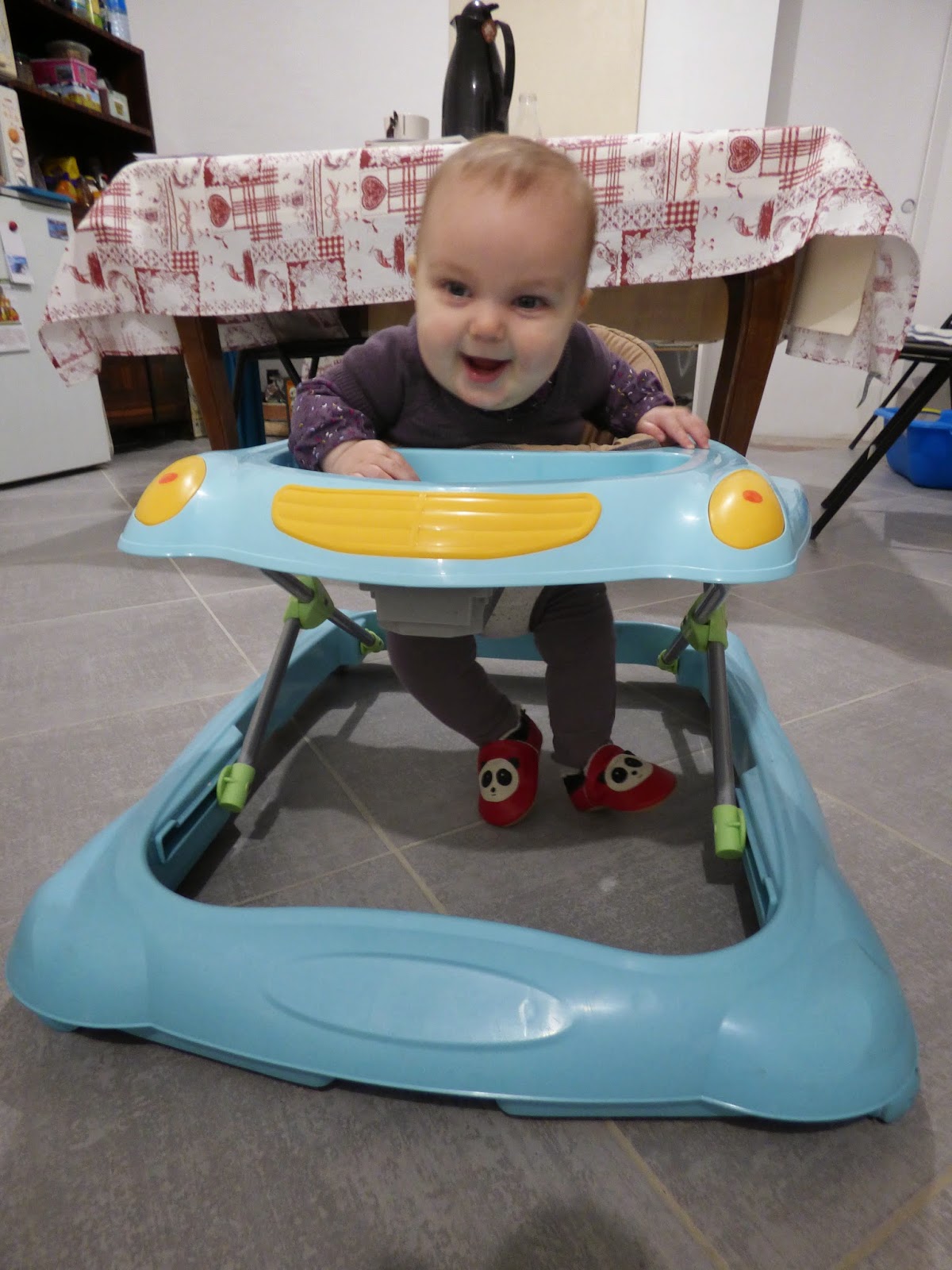 Lucie grandit, et peut maintenant profiter de plus de jouets. On lui a donc acheté un youpala, dans lequel elle arrive déjà un peu à se déplacer, une chaise haute pour manger avec nous, et une poussette canne avec laquelle on fait de chouettes balades ! Une vraie grande !