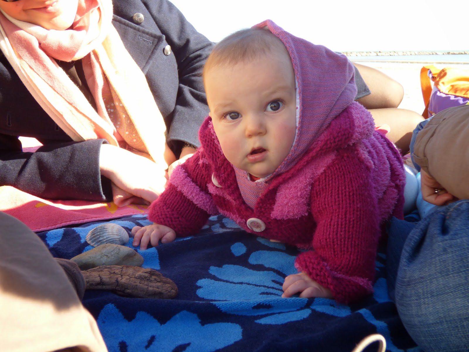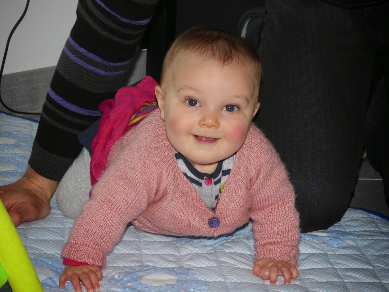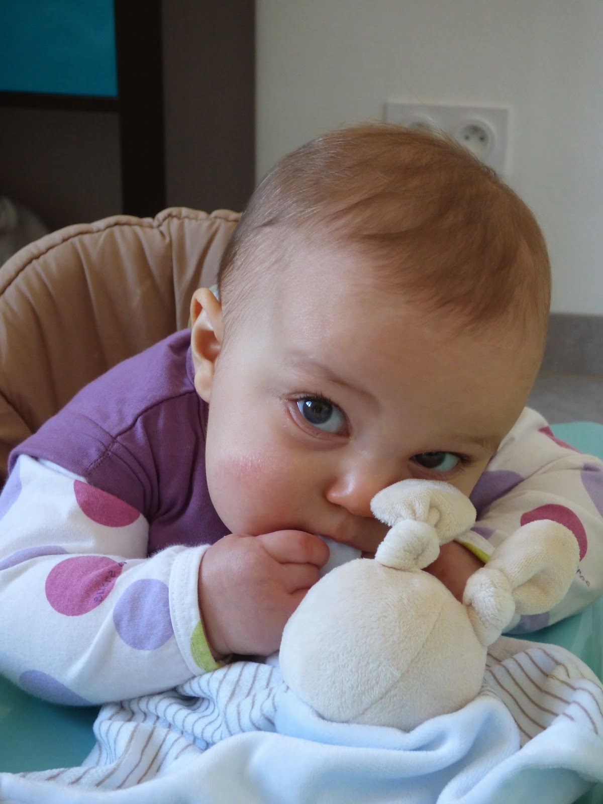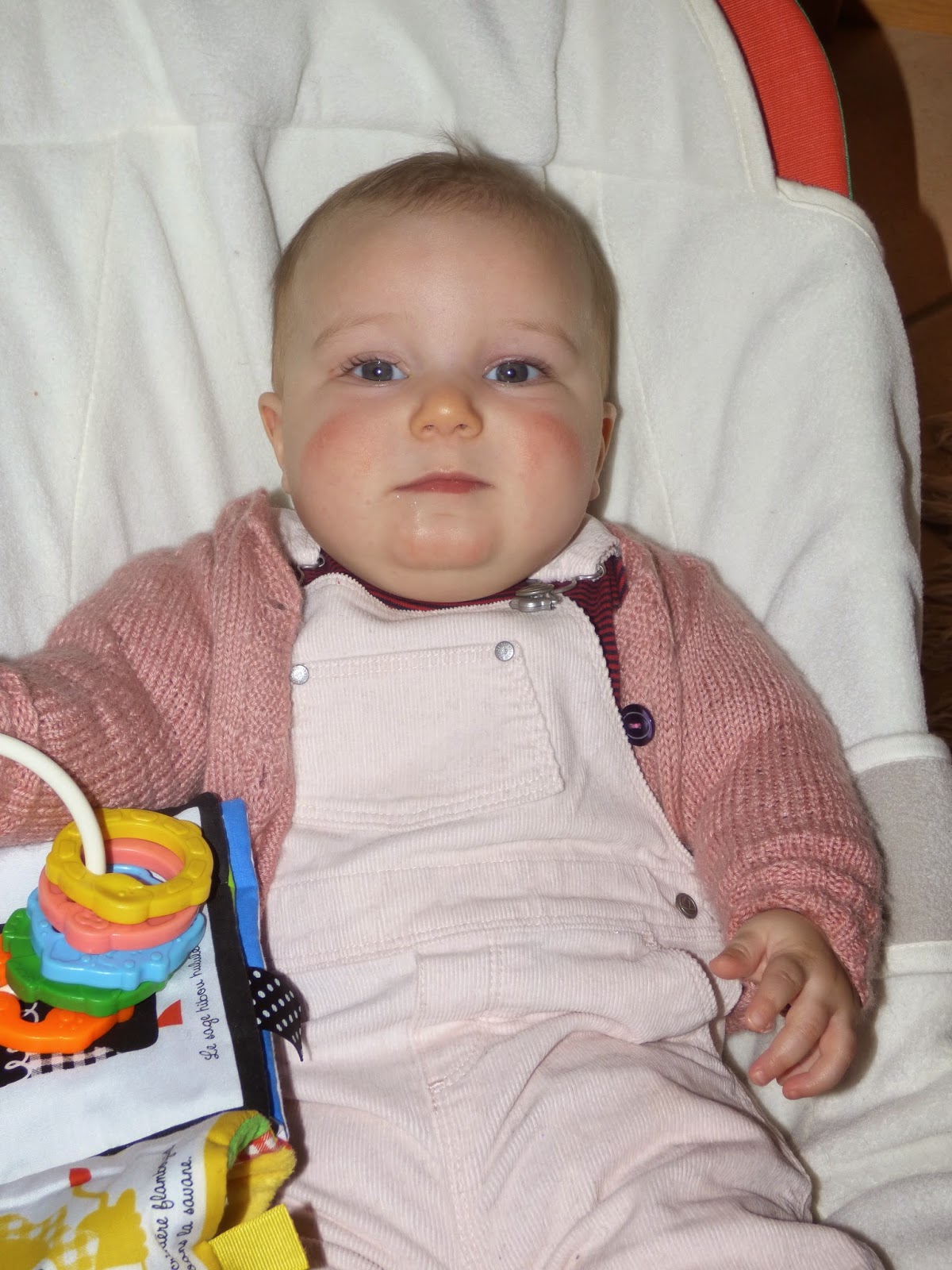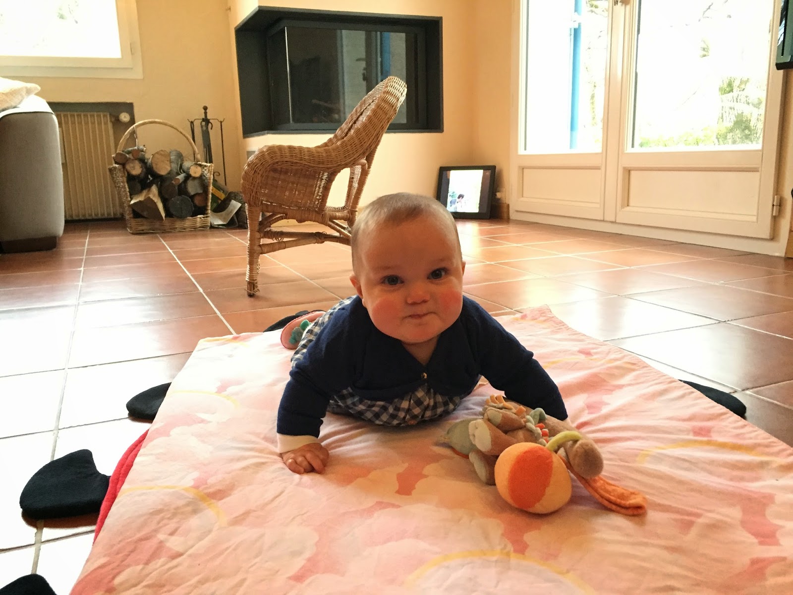 Rien que cette semaine, Lucie a sorti sa deuxième dent, a trouvé ses pieds, a réussi à se retourner du ventre vers le dos pendant sa sieste, et a commencé à rampé ! Elle tient aussi de plus en plus assise (même si il vaut mieux rester à côté encore…).