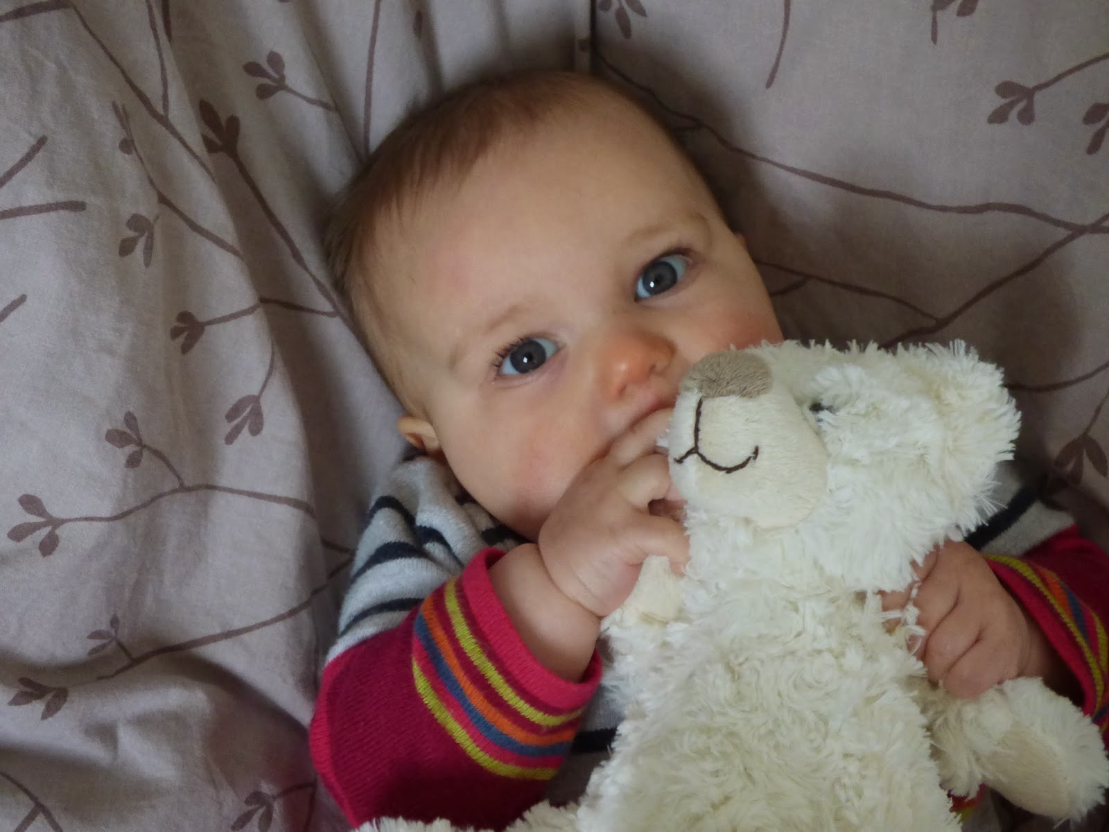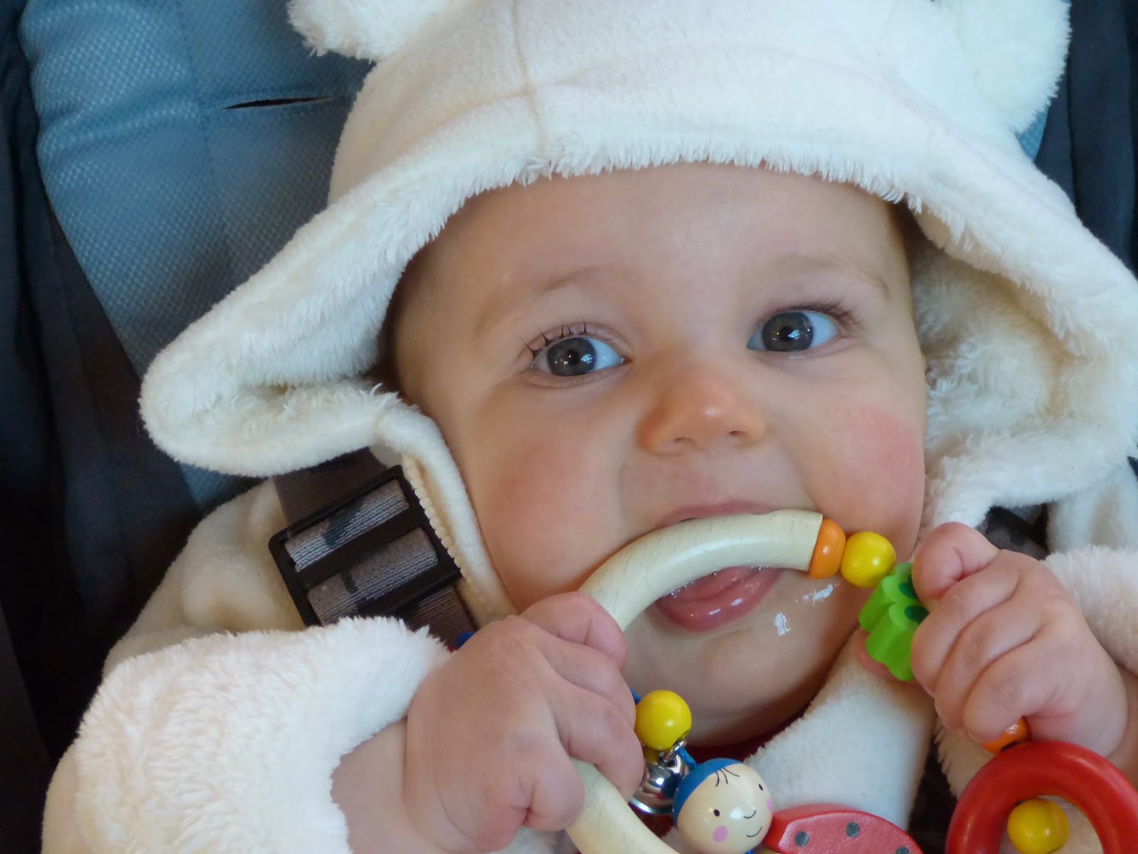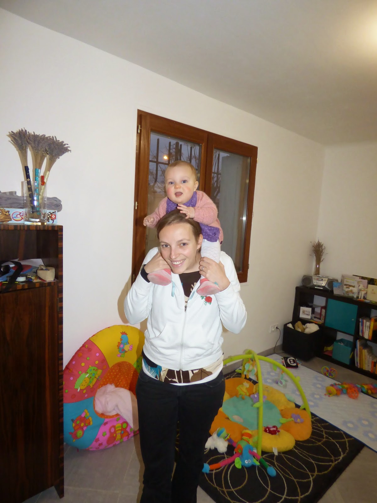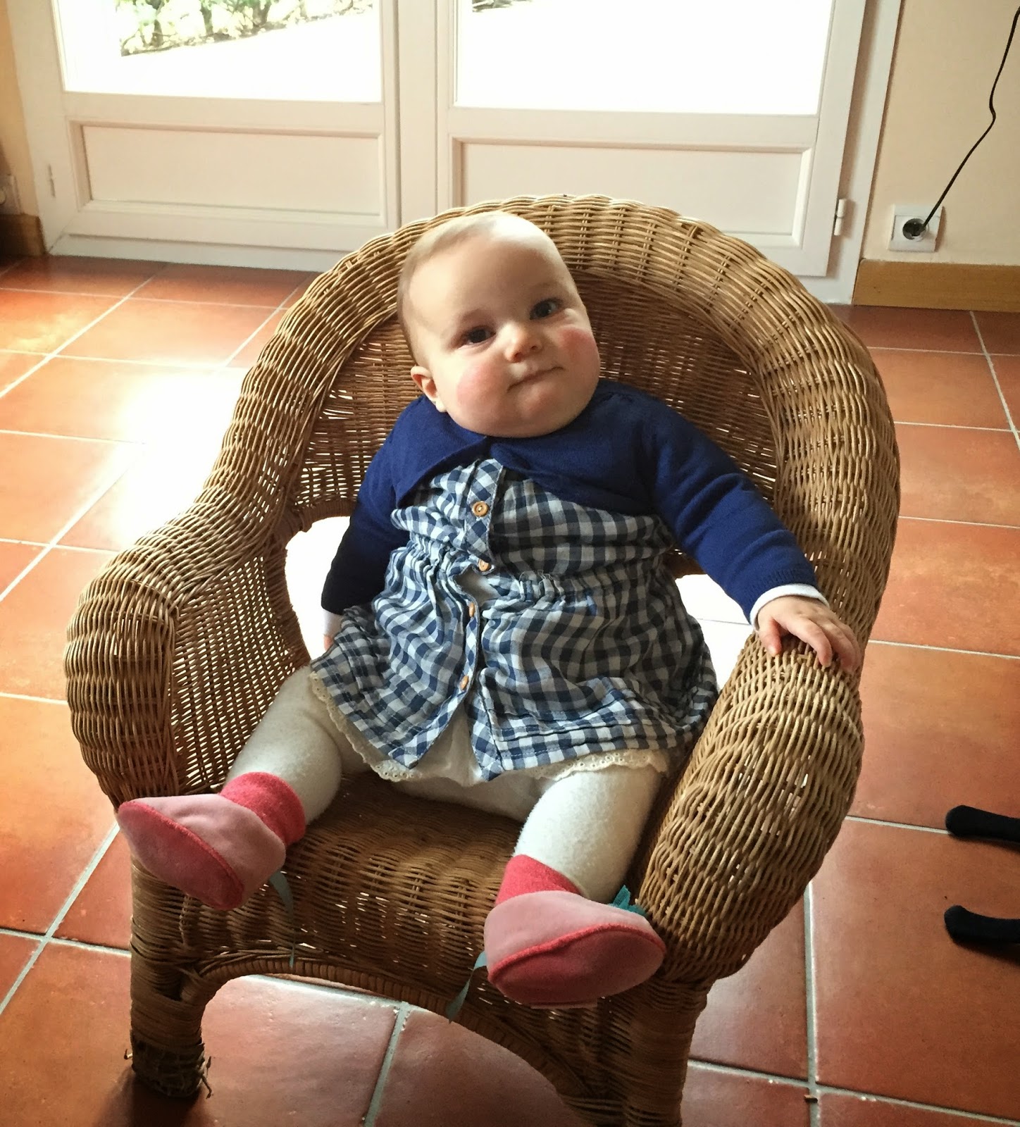 Rien que cette semaine, Lucie a sorti sa deuxième dent, a trouvé ses pieds, a réussi à se retourner du ventre vers le dos pendant sa sieste, et a commencé à rampé ! Elle tient aussi de plus en plus assise (même si il vaut mieux rester à côté encore…).