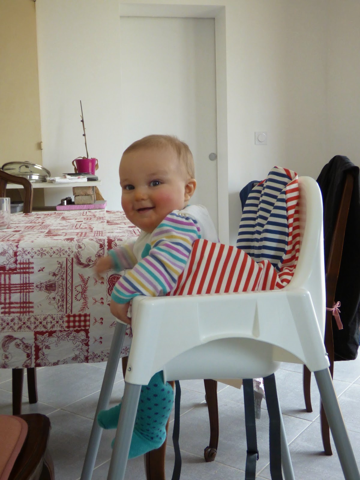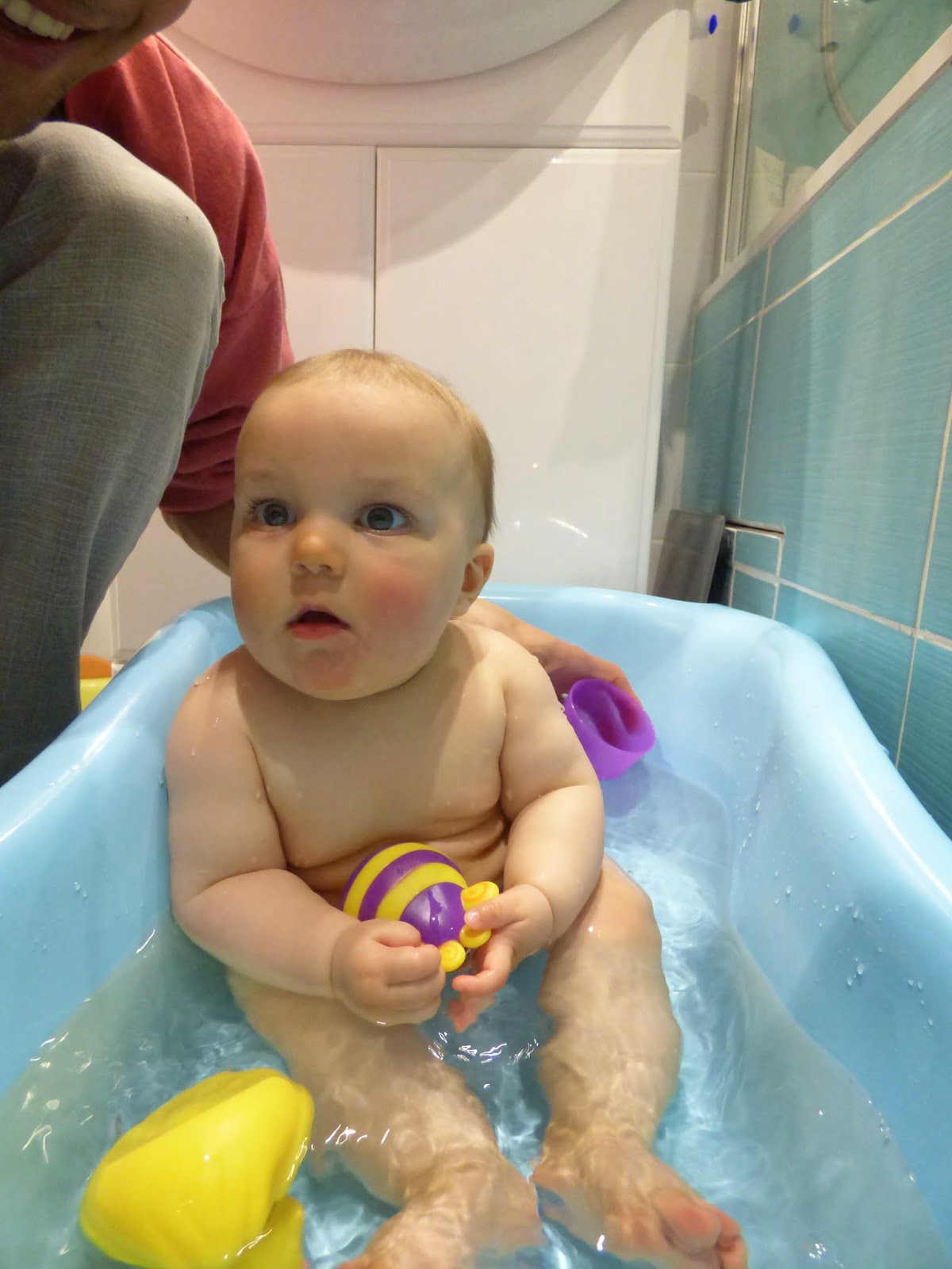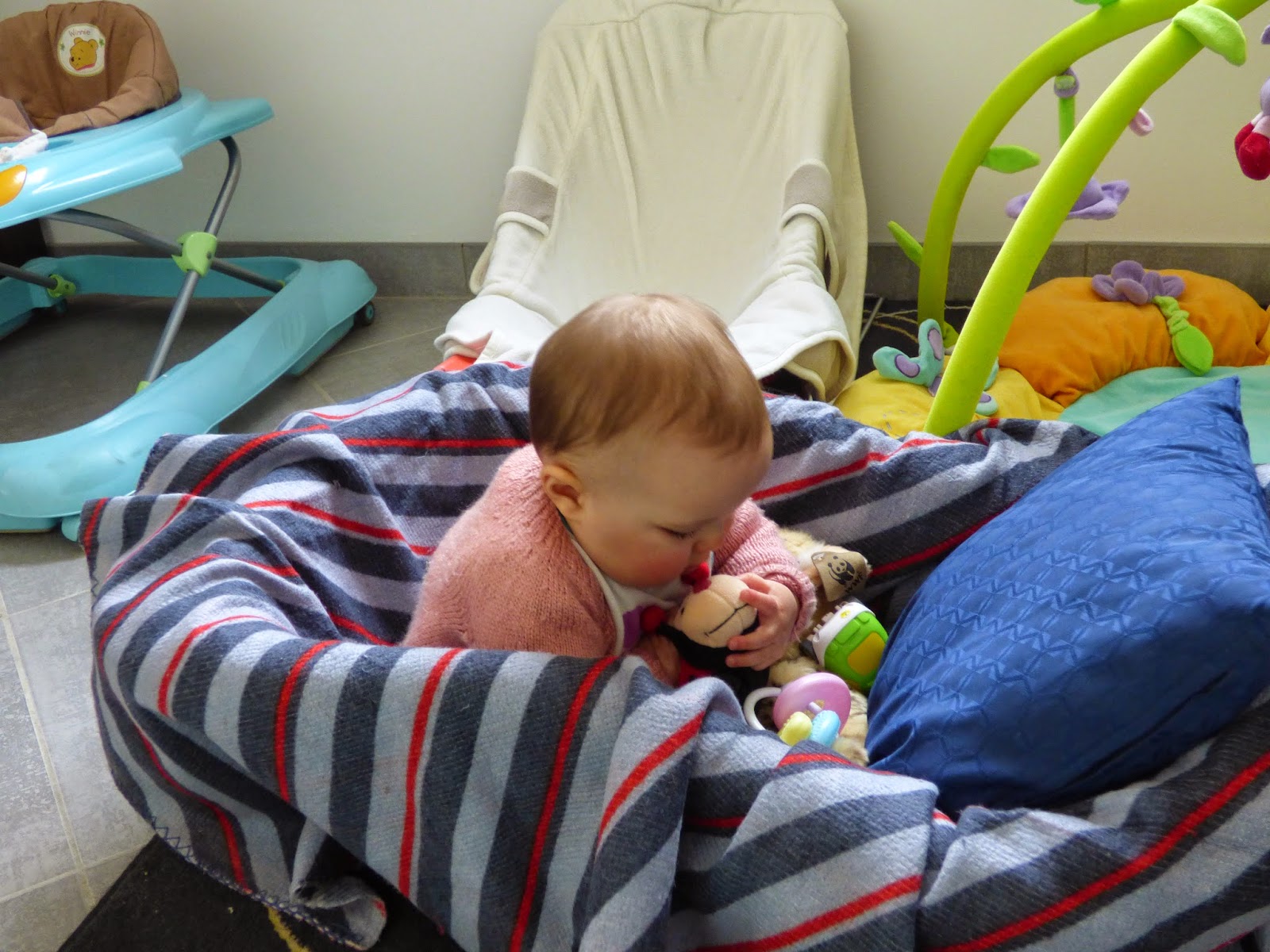 On peut enfin dire que Lucie tient assise. Dans sa chaise, son bain, son bateau, ou sur le tapis.