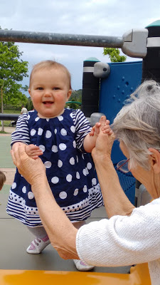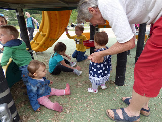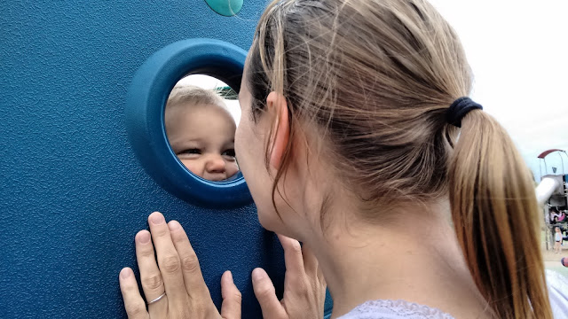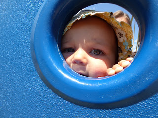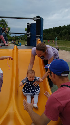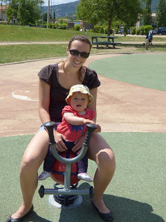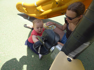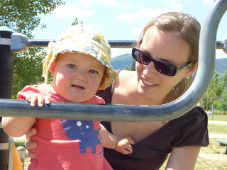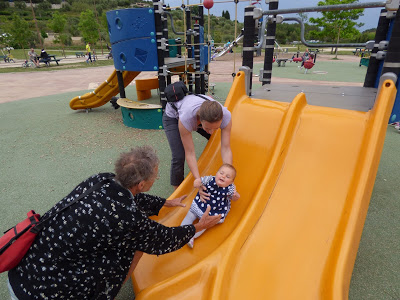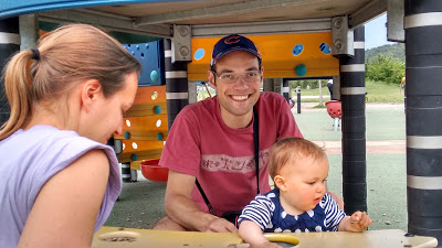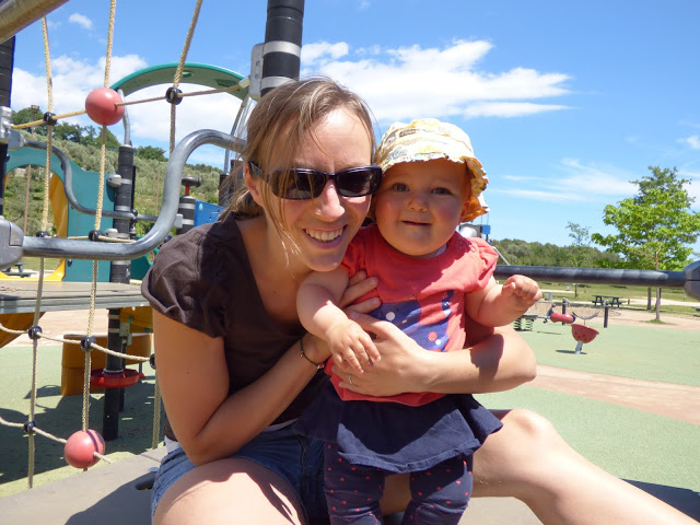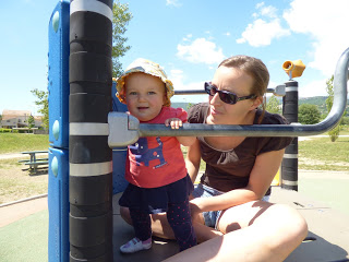 En bas de la colline, il y a une aire de jeux très sympa pour les enfants. Nous y avons amenée Lucie plusieurs fois cette semaine, car elle adore y passer du temps. Elle aime descendre le toboggan, regarder à travers les trous depuis les plateformes, jouer avec les copeaux de bois, et regarder les autres enfants !