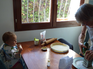Aujourd’hui, Lucie a fait de la cuisine avec sa Grand-maman : elle a fait une petite quiche à la courgette ! Elle a d’abord étalé la pate, puis l’a remplie de courgette, l’a regardée cuire, et surtout, l’a mangée !!