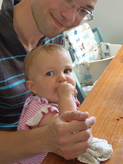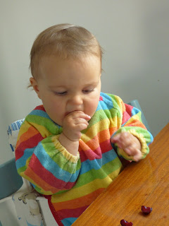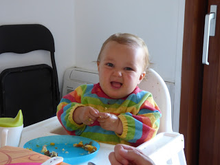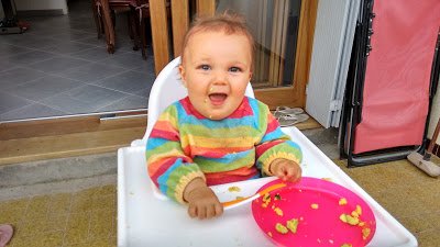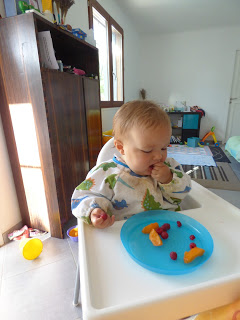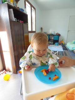 Et oui, car depuis quelques jours, Lucie mange ses repas avec nous, et se régale ! Elle mange essentiellement avec les doigts, mais mange de tout, les morceaux ne lui font pas peur. Voici quelques photos rigolotes de ses repas…