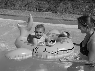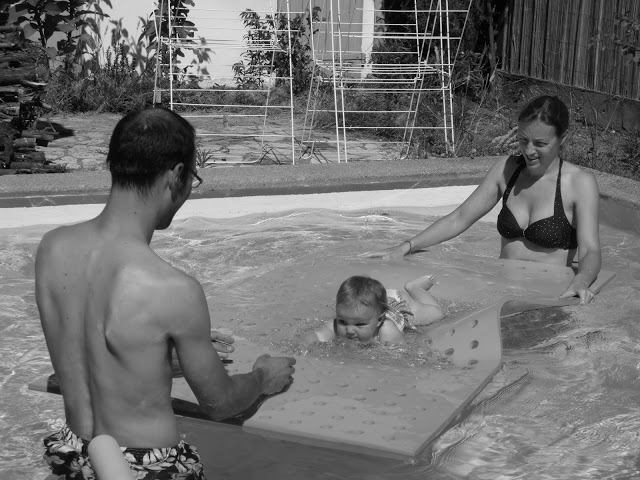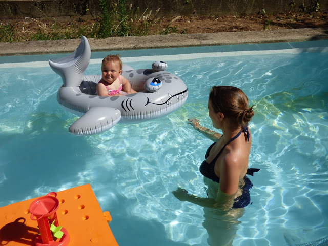Pour compléter cela, nous avons acheté un petit bateau gonflable en forme de raie, et les mêmes balles qu’aux bébés nageurs, car Lucie les aime beaucoup. Nous avons donc de quoi nous amuser follement dans la piscine, et nous ne nous en privons pas !