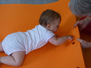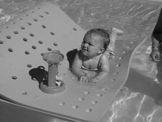 Pour son anniversaire (un peu en avance!) Grand-papa et Grand-maman ont offert à Lucie un super tapis en mousse pour la piscine, le même que celui qu’elle utilise aux bébés nageurs. Lucie se régale avec : elle peut s’asseoir dessus, ramper d’un bout à l’autre, et passer dans le tunnel. Elle y est très à l’aise, et peut ainsi bien profiter de l’eau !