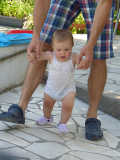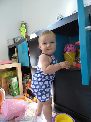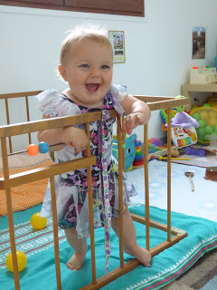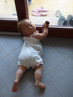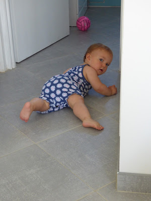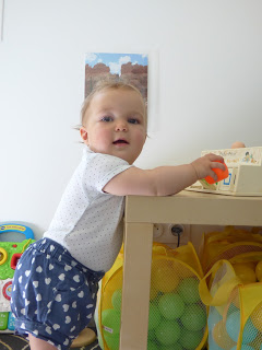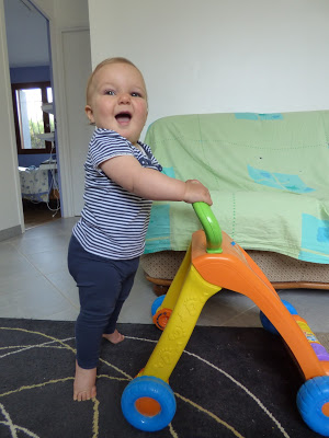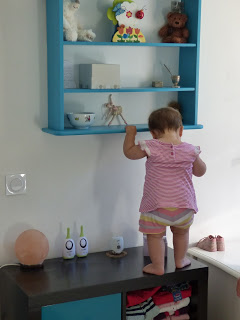 Elle sait aussi bien se déplacer debout en se tenant aux meubles. Elle peut ainsi accéder à son placard préféré, dans son aire de jeux au salon, ou aux clés du buffet de ses arrières grands-parents, le bonheur !