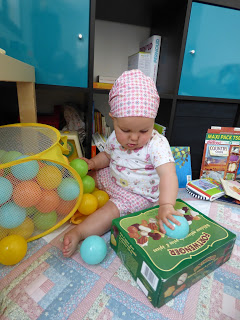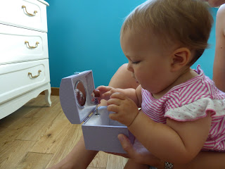 Elle a appris récemment à jouer à la balle, et est très contente d’elle quand par chance elle renvoie la balle jusqu’à nous ! Elle arrive aussi régulièrement à mettre le cylindre dans le trou rond, et le cube dans le trou carré. Il faut par contre lui indiquer quel trou essayer.