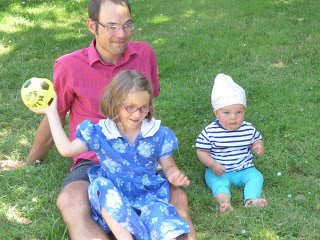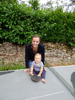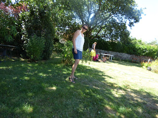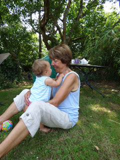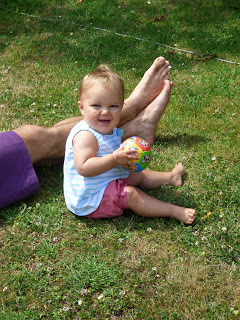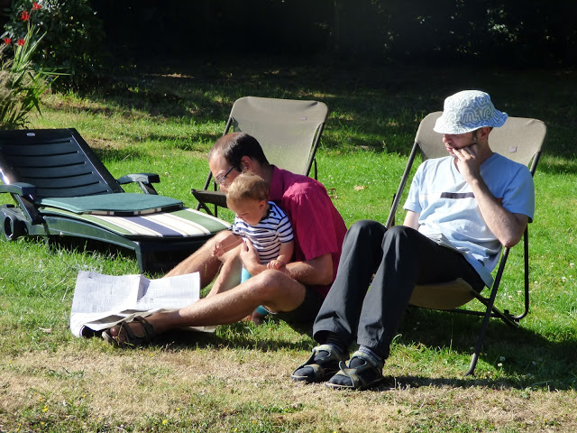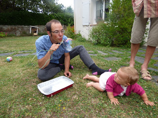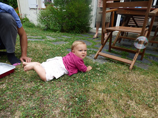 Mais nous avons aussi bien profité du jardin, avec son herbe bien verte, et toute douce pour les petits pieds de Lucie, et ses grandes zones ombragées. Elle a pu s’entraîner à marcher avec tout le monde, sans succès … pour l’instant !