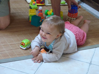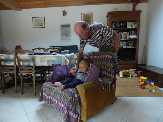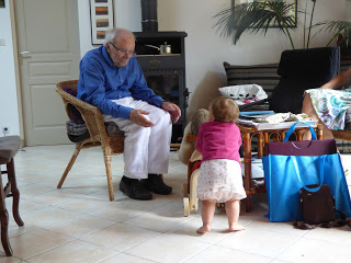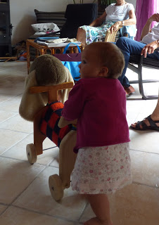 Pépi et Mémie avaient préparés plein de jeux dans leur maison pour Lucie, et elle en a bien profité. Elle a surtout aimé le chien à roulettes, qu’elle a très vite réussi à pousser d’un bout à l’autre de la maison. Elle a d’ailleurs fait une belle démonstration à Tonton Robert, venu déjeuner.