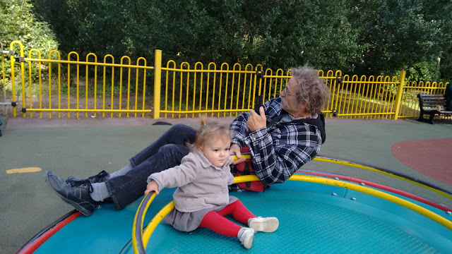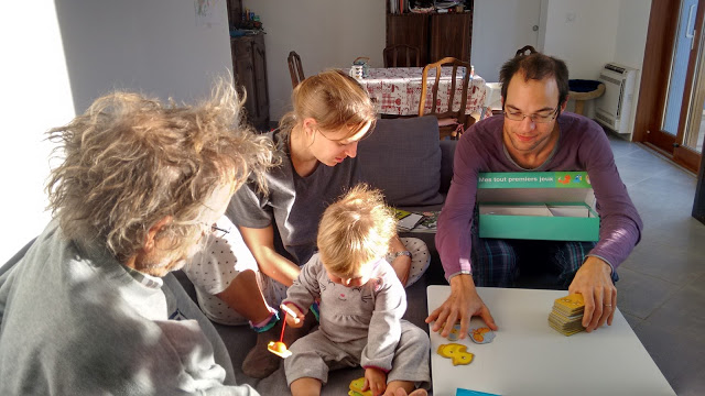 Samedi Papounet arriva, on a bien rigolé, Lucie lui a prêté 2 de ses barettes. Puis nous allâmes aux jeux, et chacun s’occupa à sa façon. Le soir en ville, Lucie a eu une grande boite, contenant des tas de jeux, ça tombait bien comme cela on ne s’est pas disputé le lendemain. Et nous allâmes encore goûter le vin à la fête des vignes, et dîner au restaurant, et Lucie a été très sage ; on peut l’emmener partout !