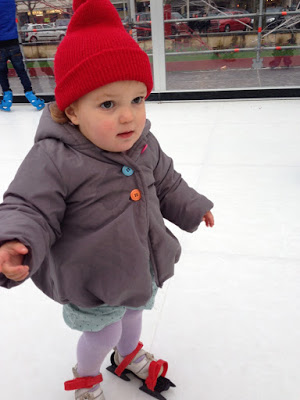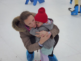 Lucie avait des petits patins double lame. Au début, elle était un peu effrayée, mais a vite pris goût à la glisse ! Elle s’est ensuite super bien amusée ! On a ensuite repris des forces avec des churros achetés par Mémie.