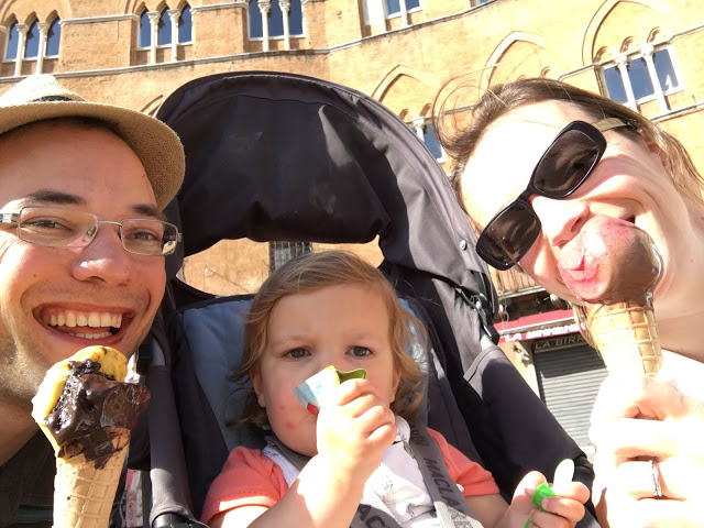 Nous avons ensuite fait un petit tour dans Sienne, mangé une glace, effrayé quelques pigeons, et marché sur le parvis de la cathédrale avant de trouver une part de pizza (pas facile avant 19h !)