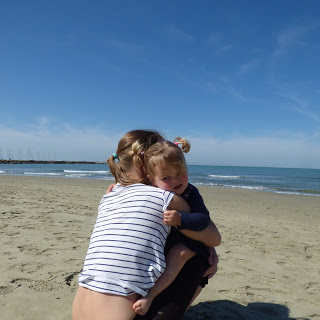 Mercredi, nous avons quitté Pise, avec le projet de retrouver Grand-Papa et Grand-Maman. Nous avons donc fait un premier arrêt à Viareggio, où nous avons passé un petit moment sur la plage. Rien à voir avec notre précédente visite au moins de juillet. À cette saison, la plage est désertique, les bars privés n’ont pas encore envahi les lieux. Par contre, Lucie a refusé de poser les pieds dans le sable, ce qui a bien limité nos activités ! Elle est restée sur mes genoux tout le temps…