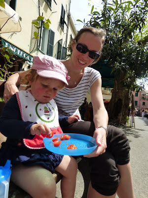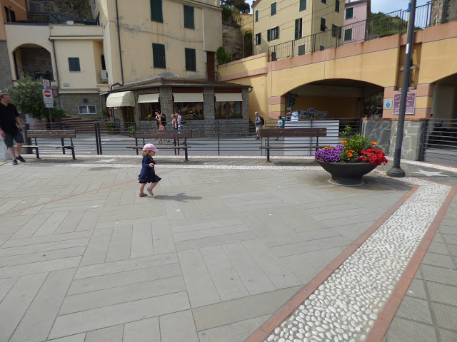 Nous avons fait notre arrêt suivant dans les Cinque Terre à Monterosso al Mare, un endroit magnifique, bien inaccessible, mais néanmoins bien touristique ! Lucie s’est régalé d’un petit pique-nique à base de melon et de tomates (nous avons du la forcer à gouter le melon, pour qu’ensuite elle s’enfile toute la portion, sans nous en laisser une miette… ce n’est pas la première fois qu’elle nous fait le coup !). Nous nous sommes promenés au bord de la mer, avons fait une longue pause près des grands pots de fleurs, et avons terminé à l’aire de jeux, que Lucie a beaucoup appréciée.