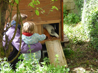 Deux nouvelles pensionnaires dans le jardin de Préfailles : Apou, jolie petite poule rousse choisie par Lucie et Lily, la belle poule blanche de Gali.