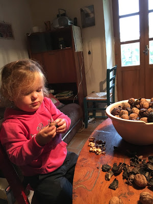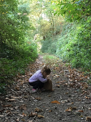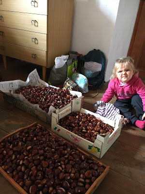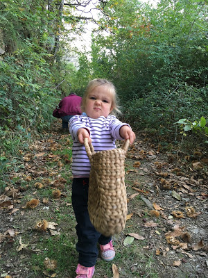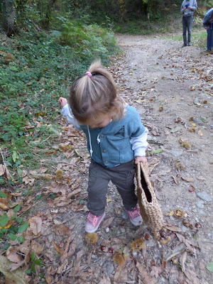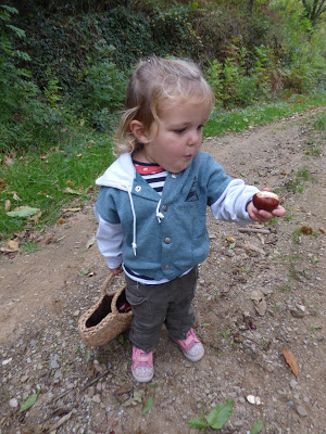 Nous étions à la saison idéale pour ramasser les châtaignes : Lucie a adoré écraser les bogues avec ses chaussures magnifiques (elles clignotent !, pour ensuite mettre les châtaignes dans son panier.