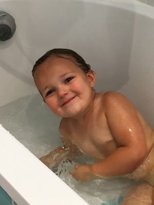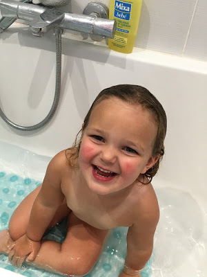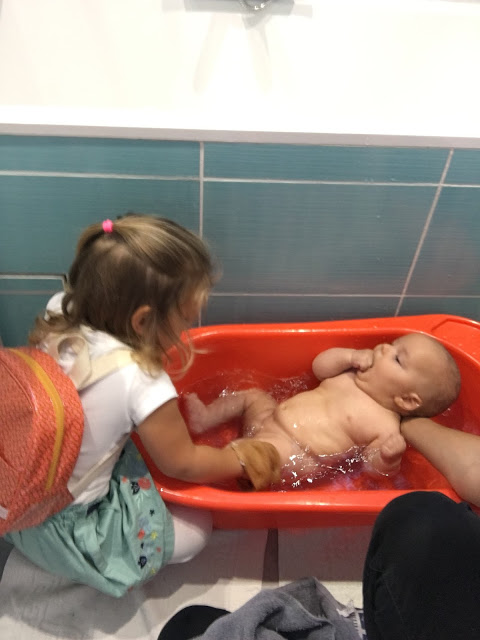 Il utilise lui aussi la baignoire de son papa, et plus rarement (car les horaires ne collent pas souvent, et ce n’est pas simple d’être disponibles pour les deux en même temps au moment de la sortie du bain !) prend son bain avec Lucie !