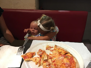 Puis nous sommes allés à la pizzeria 🙂 Lucie a fini le repas en se renversant la mousse au chocolat sur sa robe. Puis elle a aidé Agathe a ramener sa valise à la maison.