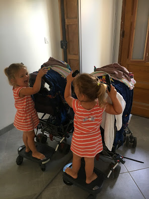 Nous sommes allés, Lucie, Émile et moi, acheter une planche pour mettre derrière la poussette pour que Lucie puisse se mettre debout dessus quand je pousse Émile. Lucie et moi l’avons installée, et ce soir, nous l’avons testée en allant à la médiathèque. Lucie était aux anges. Elle a répété plusieurs fois : “je l’adore, je l’adore, je l’adore !”.