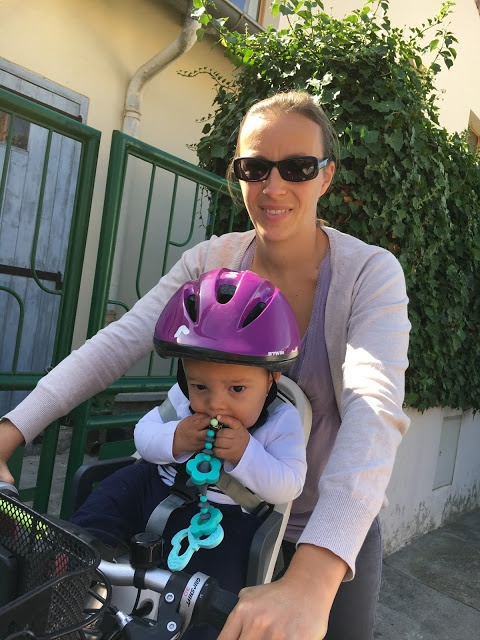 Nous avons acheté un siège vélo avant pour Émile, et l’avons essayé ce matin pour notre dernier jour de vacances. Il n’était pas très content au moment de devoir accrocher les sangles, mais une fois en route, il a beaucoup aimé !