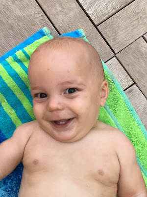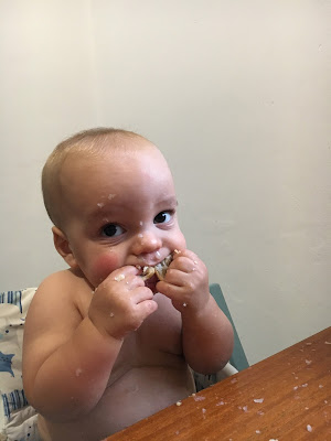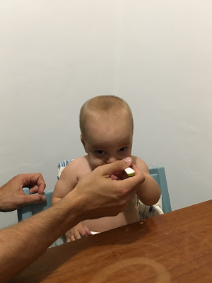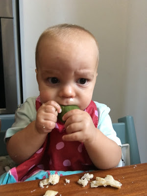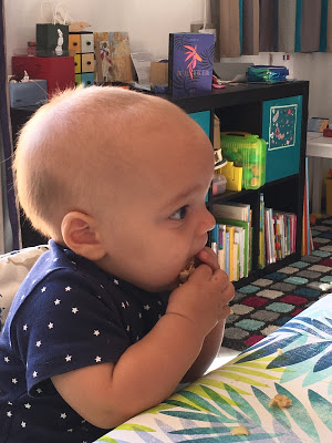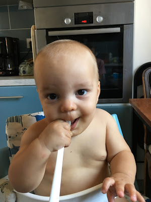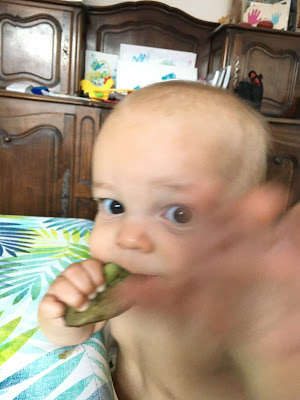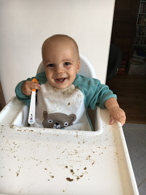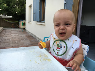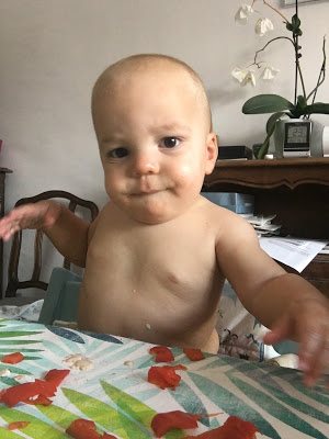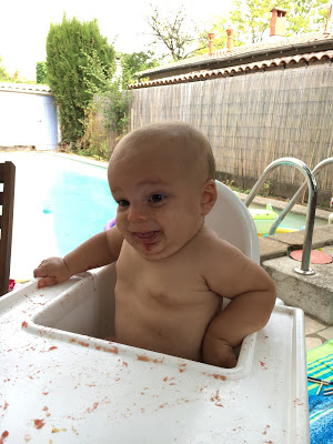 Je l’ai souvent mis en couche pour manger, et rincé dans son bain ou sous la douche après, mais heureusement qu’il progresse, car la température commence à être un peu juste pour manger tout nu, surtout le soir ! Au goûter, je lui propose souvent une pompote, car il en mange très proprement, et je n’ai pas le courage de rajouter encore un séance de ménage/nettoyage !