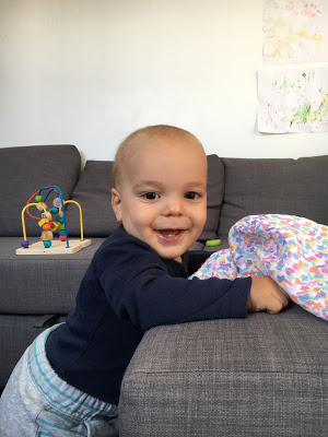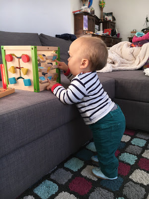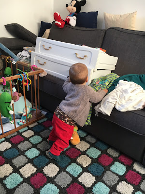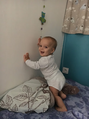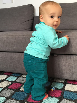 Émile sait se mettre debout depuis plusieurs semaines, et maintenant qu’il a bien gagné en stabilité, il passe la plupart de son temps dans cette position. Il n’a besoin pour se lever que d’un support quelconque : jambe de maman, canapé, bibliothèque, dinette, parc…