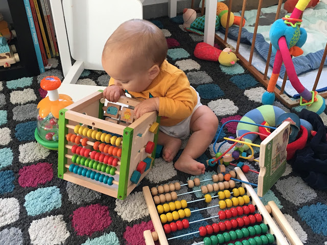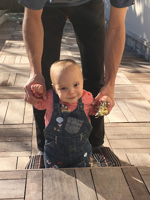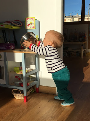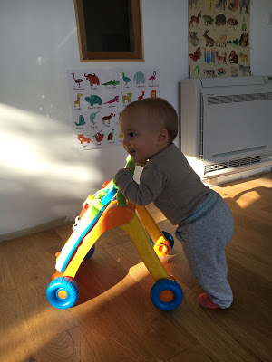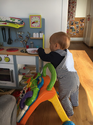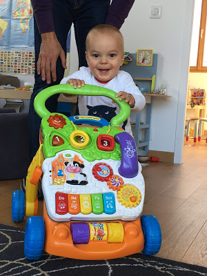 Il est capable de traverser la salle de jeux avec son trotteur, sans aucune aide. Il aime aussi marcher en nous tenant, avec les deux mains pour l’instant.