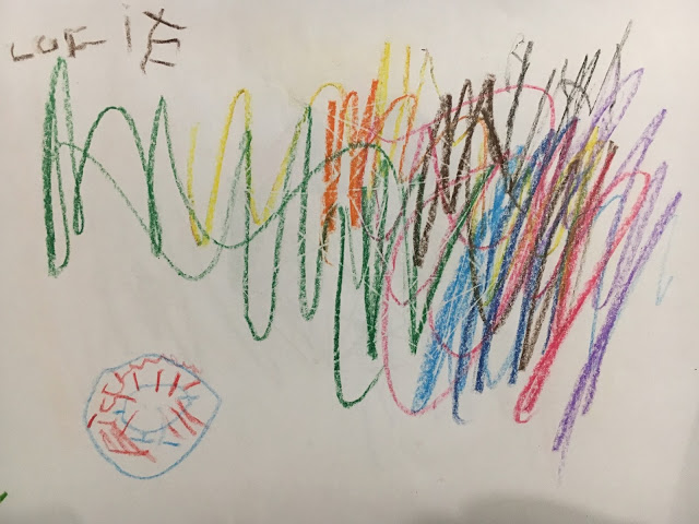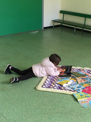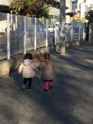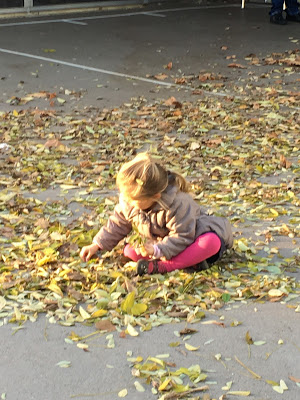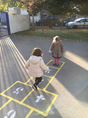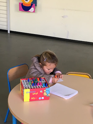 C’était amusant de pouvoir observer les enfants jouer “ensemble”. Le plus gros de leur activité consiste à se courir après les uns les autres. Ce n’est malheureusement pas l’activité préférée de Lucie, que l’on trouve souvent maladroite dans ses interactions avec les autres enfants… Roch nous l’a souvent dit, la récréation n’est pas son moment préféré de la journée ! Par contre, elle a trouvé des enfants pour jouer avec elle au Uno, et là elle était ravie ! Elle a aussi fait un très joli dessin, plus complet que d’habitude puisqu’en plus des griboullis habituels, elle a fait un auto-portrait (“Tu as vu Maman, mes cheveux sont rouges et mes jambes sont bleues”) !