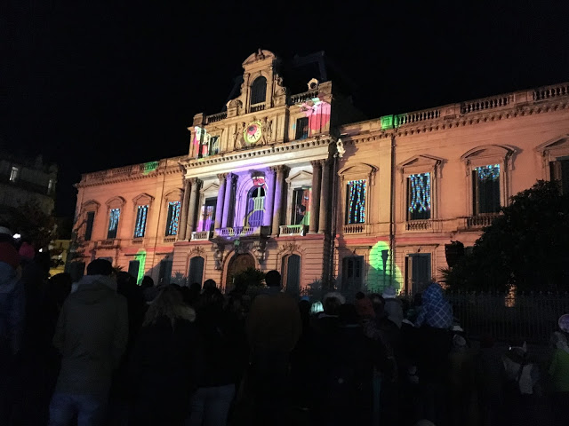 Ensuite, nous avons été au Coeur de Ville en Lumières : à la nuit tombée, sur divers bâtiments sont projetés des films. Sur la façade du musée Fabre, une projection pleine de références artistiques et sur la Préfecture, une projection plus musicale, qui utilisait largement les éléments de la façade (fenêtres, colonnes, balcons, …). Lucie et Émile ont beaucoup aimé, mais le froid et la fatigue ont eu raison de nous, et nous sommes vite rentrés coucher tout ce monde. On avait l’impression de rentrer à 2h du matin vu leur état, mais il était seulement 20h… Mais si Lucie est sage, on retournera demain !