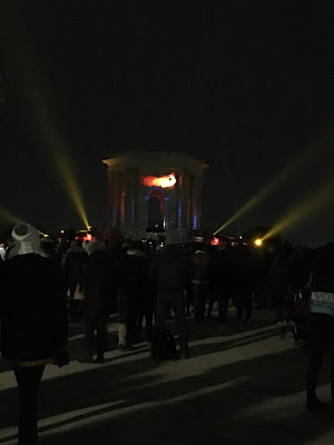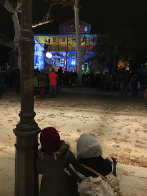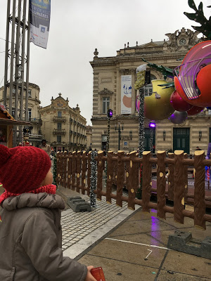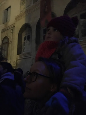 Le soir, nous sommes retournés en ville, pour revoir les projections lumineuses. Lucie a effectivement dormi sur le dos d’Agathe dans l’après-midi, et on avait promis qu’on y retournerait dans ce cas 😉 Et elle a encore plus aimé qu’hier soir. On a commencé, à sa demande, par revoir les mêmes qu’hier, et on a ensuite continué : l’une sur l’église Saint Roch et pour finir au Peyrou. C’était la dernière la plus impressionnante de toutes : sur la musique de Fantasia, une personne habillée d’une combinaison lumineuse au centre du château d’eau se prenait pour l’apprenti sorcier, et de part et d’autre du château d’eau des lances flammes complétaient le tableau. Très impressionnant !