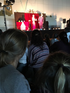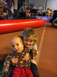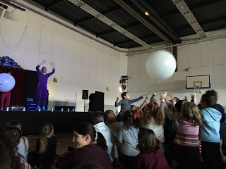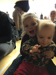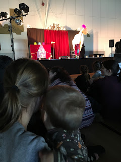 Nous sommes arrivés juste à temps pour le spectacle : deux clowns qui essaient de faire de la magie.  Un spectacle sans paroles, où Lucie et nous avons bien rigolés, et Émile a bien regardé ! Il a aimé les musiques, le drôle de cheval et les gros ballons blancs.
