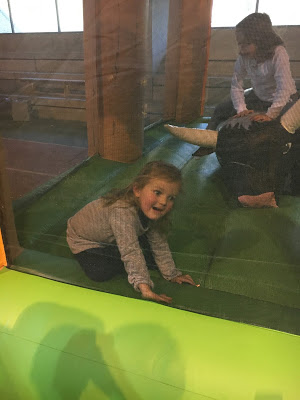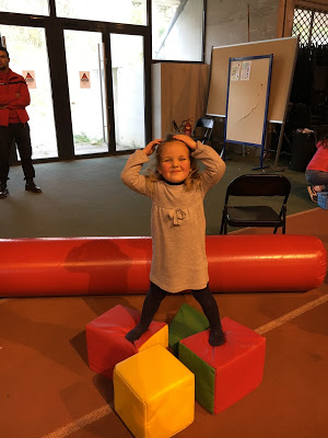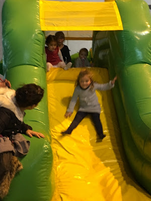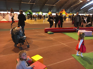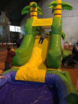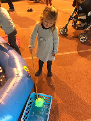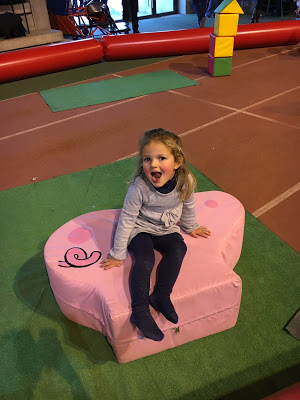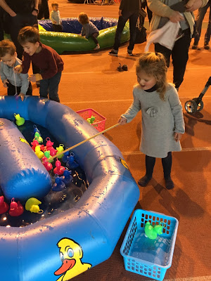 Puis, nous sommes rapidement passés devant le goûter (Lucie n’est pas gourmande ces temps cis, les repas ne sont pas son moment préféré, surtout qu’il faut se laver les mains avant… quelle corvée !). Donc nous sommes allés directement dans la zone de jeux : châteaux gonflables, toboggans, pêche aux canards, … Après avoir pas mal hésité, Lucie s’est beaucoup amusée ! Elle a aussi beaucoup couru à travers le grand gymnase.