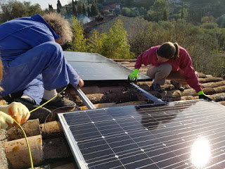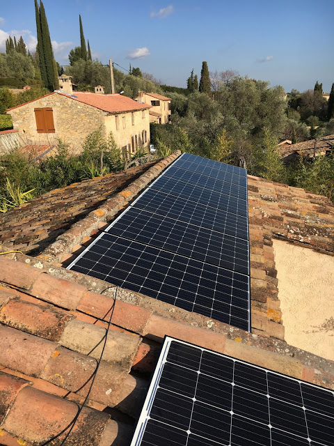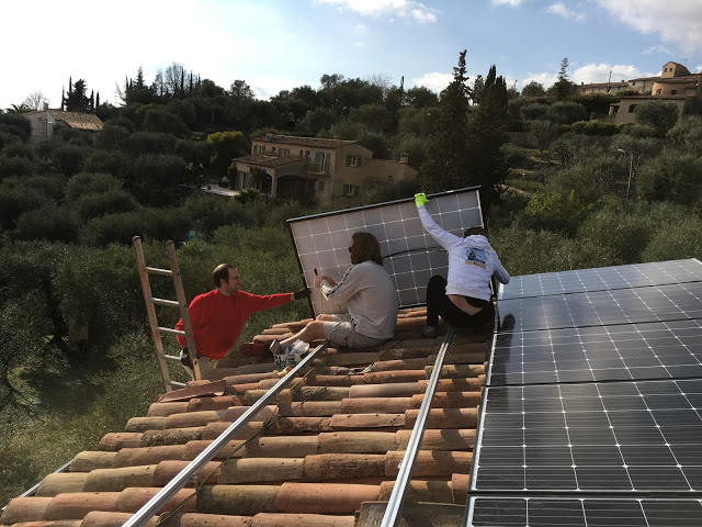 Ce week-end, nous sommes allés à Opio donner un coup de main à Grand-Papa pour poser ses panneaux photovoltaïques sur le toît. Il avait tout préparé, les rails notamment, il ne restait “qu’à” monter les panneaux. Mais avec notre équipe de choc (Eric, son copain Ricco, Victor, Agathe, Thomas et moi – Maman s’est occupée des enfants), nous avons terminé bien avant la nuit 😉