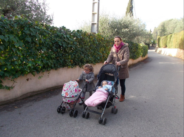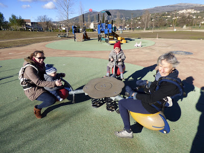 Nous avons fait des balades, en double poussette et en double manduca, jusqu’aux jeux en bas de la colline.