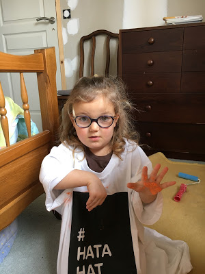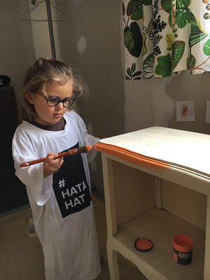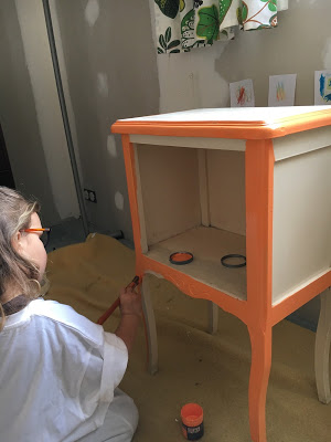 Aujourd’hui, Lucie et moi avons peint une vielle table de nuit pour l’assortir à la chambre de Lucie. Je voulais le faire depuis un moment, et nous avons enfin pris le temps. J’ai été épatée de voir Lucie peindre aussi longtemps, et avec tant d’application ! Elle a fait plus de la moitié de la peinture orange, et un peu de jaune. En tout cas, la table de nuit rend très bien, et Lucie l’a vite adoptée !