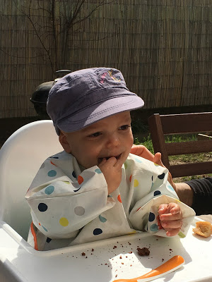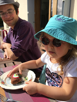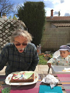 Nous avons commencé par fêter l’anniversaire de Grand-Papa, sous un magnifique soleil, avec un gateau décoré par Lucie. Premier repas sur la terrasse cette année.