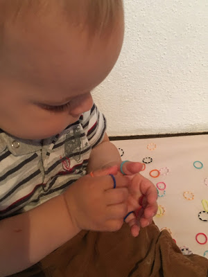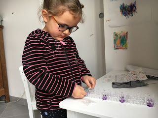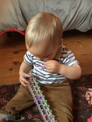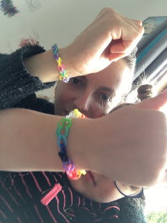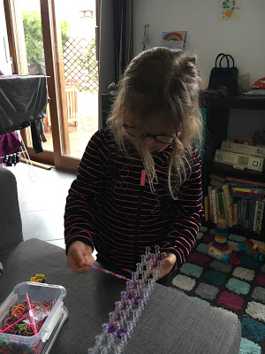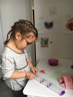 Un peu par hasard, nous avons acheté à Lucie un kit pour fabriquer des bracelets en élastiques. Et elle a beaucoup accroché ! En quelques jours elle en a déjà fait plein ! Bon, pour l’instant, elle place les élastiques sur le métier à tisser, et c’est moi qui les crochète.