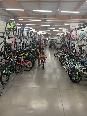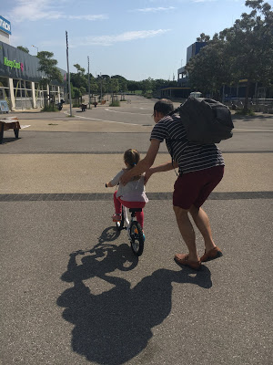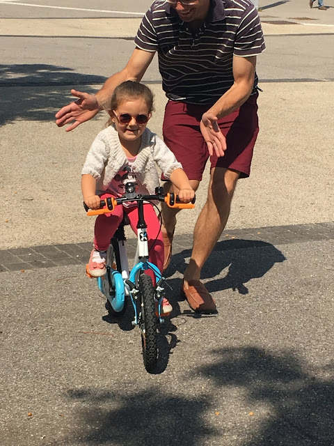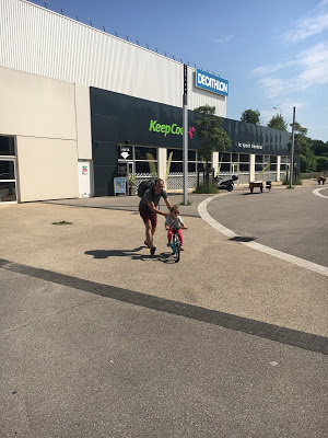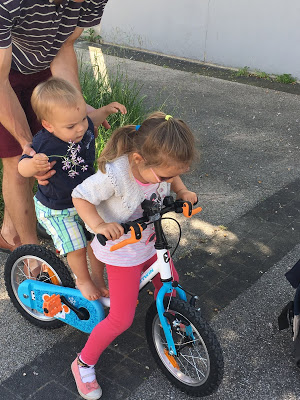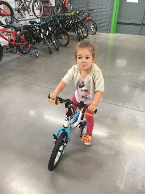 Aujourd’hui, Lucie a eu son premier cadeau d’anniversaire de 4 ans… bien en avance ! Il s’agit d’un beau vrai vélo ! Depuis le temps qu’elle en rêve. Nous sommes donc allés le choisir ce matin, et à peine acheté, elle l’a essayé…et adopté ! Au bout de quelques essais, elle réclamait qu’on la lâche. Elle a tout de suite eu un très bon équilibre, grâce à la draisienne qu’elle a beaucoup pratiqué. Reste plus qu’à apprendre à démarrer !
