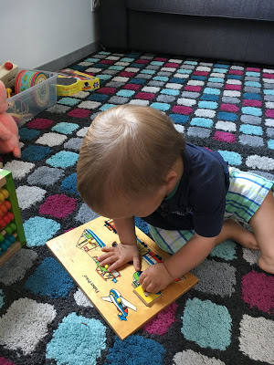 Émile aime faire ce puzzle des moyens de transport ces jours cis. Et depuis peu, il y arrive tout seul ! Et il en est très fier !
