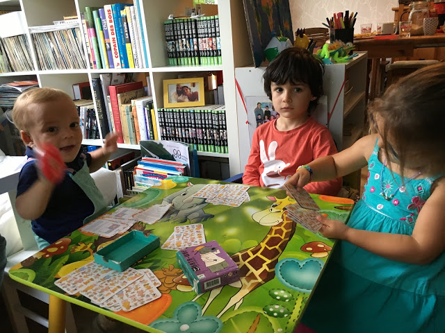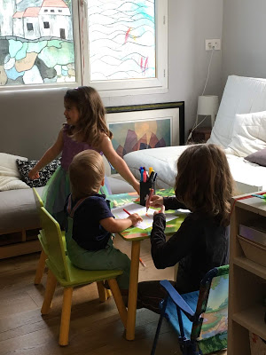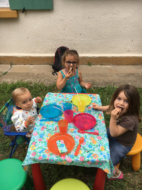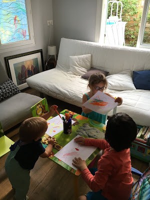 Cette après-midi nous sommes allés prendre un goûter/apéro chez Justine, une copine d’école de Lucie. Nous avons commencé dehors mais avons vite du nous rapatrier dedans car la pluie s’intensifiait ! Émile a pris le goûter à la table des enfants, et il en était très fier ! Il a aussi voulu dessiner et jouer avec eux à Batawaf.