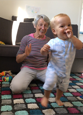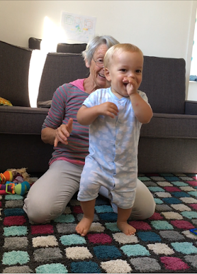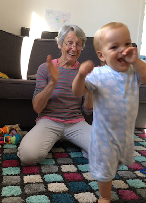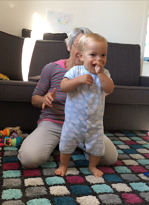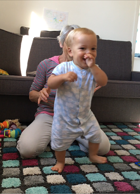 Et bien bravo Emile! Même pas besoin d'équilibrer avec les bras (photo classique des 1ers pas). En fait, il savait marcher mais attendait le bon moment avec public pour se lancer. Le coquin, d'ailleurs faut voir son sourire…