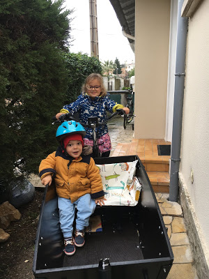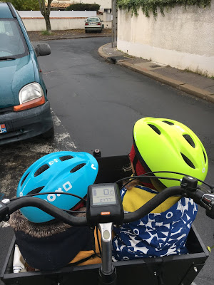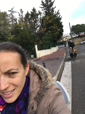 Nous avons emprunté notre itinéraire hebdomadaire : école, crèche, lycée. Le vélo passe bien partout 😉 Nous sommes bien décidés à en acheter un …