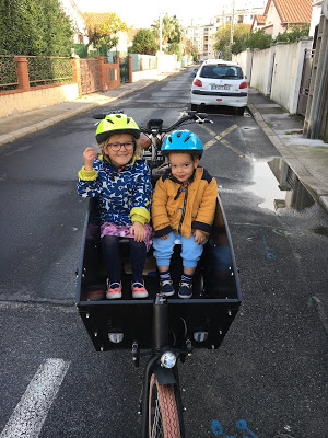 Aujourd’hui, nous avons emprunté le vélo cargo de copains pour l’essayer pour la journée. Et nous avons adoré, autant nous que les enfants. La conduite est agréable, on s’y habitue très vite. L’assistance électrique est très appréciable, et les enfants ont adoré être assis sur le petit banc côte à côte.