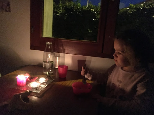 Par contre, mauvaise surprise, quelques minutes après être rentrés (et on était assez contents de nous, car on était allés se garer dans un petit parking à côté plutôt que dans celui de l’Arena pour éviter potentiellement 2h de bouchons à la sortie…) notre compteur electrique a sauté… Impossible de le faire réparer avant le lendemain midi… Du coup, dîner (froid), coucher et copies aux bougies, puis réveil et douche le lendemain encore aux bougies… Qu’est-ce qu’on est dépendants de l’electricité !
