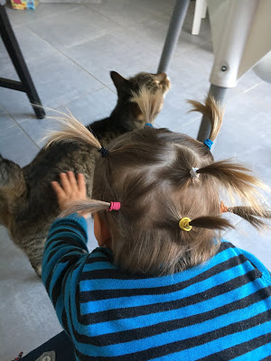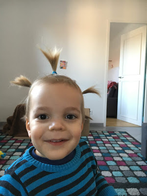 Émile aime beaucoup quand je coiffe Lucie le matin, car c’est l’occasion de farfouiller dans la boite à chouchous. Cette après-midi, en rentrant de la crèche, il est allé chercher la boite par lui même, et m’a demandé de lui faire des couettes … beaucoup de couettes ! Il était très satisfait du résultat 😉