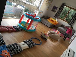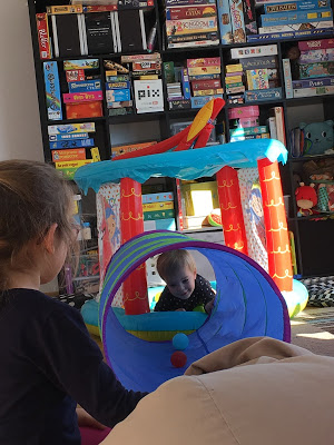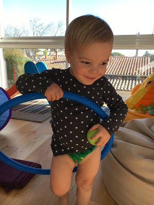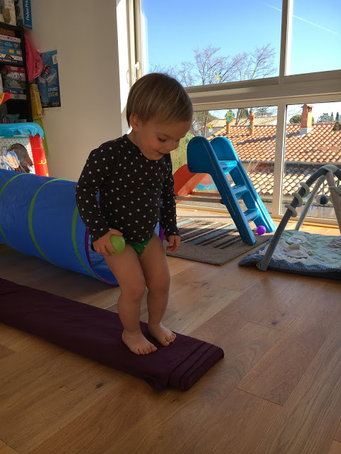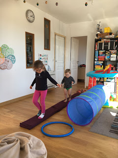La salle de jeux est transformée en salle de motricité pour l’occasion, Lucie et Émile testent le parcours,