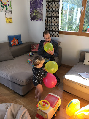 Émile et Thomas gonflent des ballons,