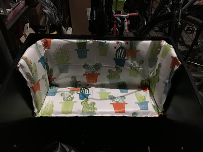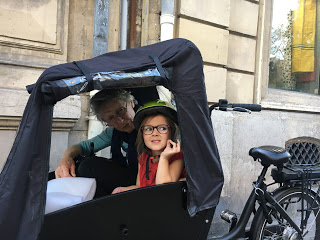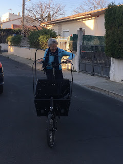 Démonstrations de vélo cargo – Grand Maman l’a testé, à vide, et moi je l’ai ramené du centre ville avec Lucie dans la caisse 😉